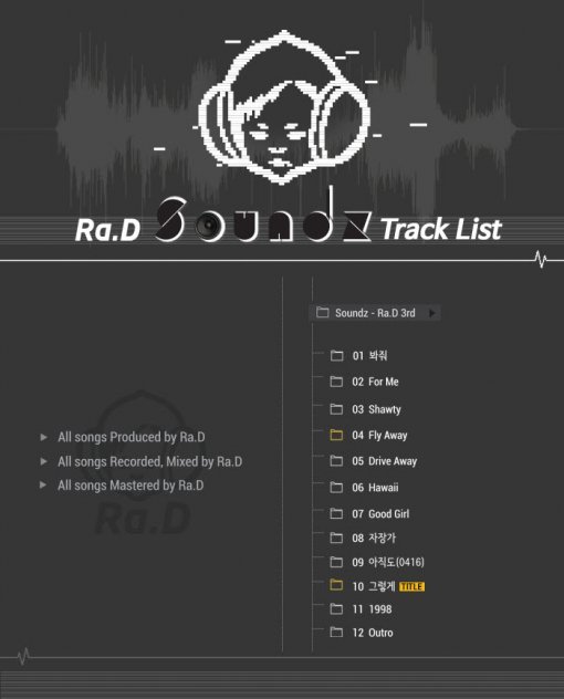 라디(Ra.D)는 오는 24일 ‘사운즈(Soundz)’ 발매를 앞두고 지난 16일 자신의 공식 페이스북을 통해 ‘사운즈(Soundz)’ 수록곡 리스트를 공개했다.