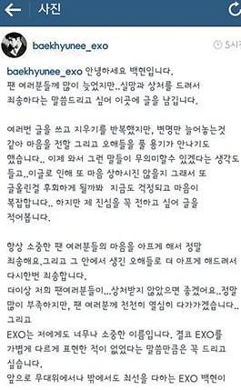 백현은 17일 자신의 인스타그램에 “안녕하세요 백현입니다. 팬 여러분께 많이 늦었지만 실망과 상처를 드려서 죄송하다는 말씀을 드리고 싶어 이곳에 글을 남깁니다”라고 시작하는 심경 고백글을 올렸다.