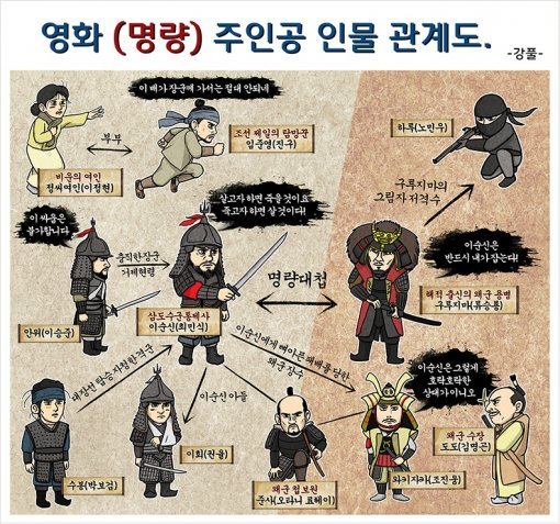인기 웹툰 작가 강풀이 그린 영화 ‘명량’(제작 빅스톤 픽처스|제공/배급 CJ엔터테인먼트) 인물 관계도가 화제다.