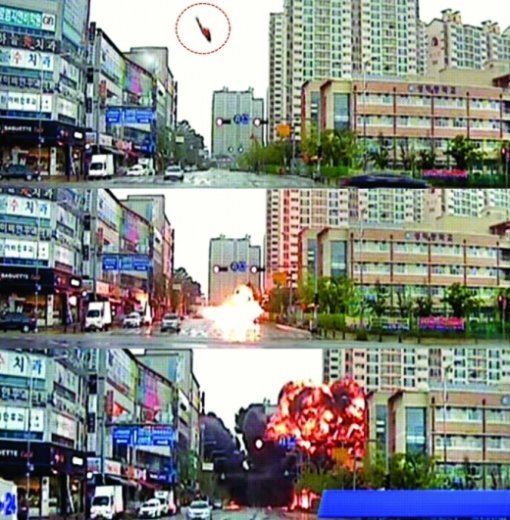 YTN은 아파트 부지 인도에 헬기가 추락하는 사고 순간이 찍힌 차량 블랙박스 영상을 공개했다. 공개된 영상에는 인근 도로에서 갑자기 불길이 크게 치솟는 장면이 담겨 있다.