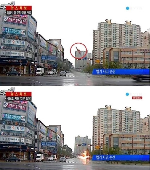 이날 YTN이 공개한 헬기 추락 영상은 사고 현장에 있던 차량의 블랙박스에 찍힌 것이다. 영상에는 상공에 있던 헬기가 단 몇초만에 도로에 곤두박질치는 순간이 담겨 있다.
