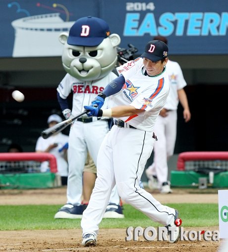 18일 오후 광주 기아챔피언스필드에서 열린 ‘2014 프로야구 올스타전’ 홈런왕 레이스에 참가한 두산 김현수가 힘차게 타격하고 있다.