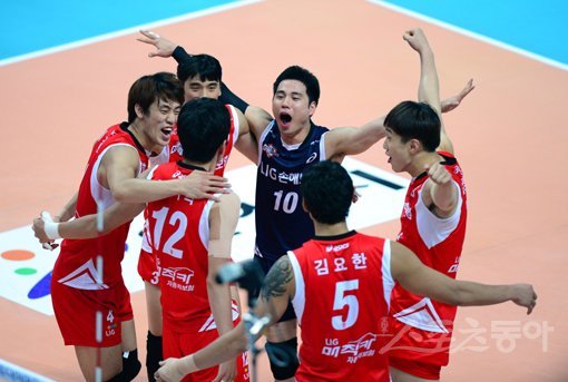LIG 손해보험의 정기혁(12번)이 20일 안산상록수체육관에서 열린 ‘2014안산-우리카드컵 프로배구대회’ 대한항공전에서 공격을 성공한 뒤 동료들의 환영을 받고 있다. 안산|김민성 기자 marineboy@donga.com 트위터 @bluemarine007