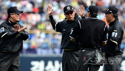 프로야구가 후반기부터 심판합의판정제도를 시행한다. TV 중계화면에 의존한 비디오 판독 도입이다. 이에 따라 비디오 판독을 놓고 구단마다 전담직원을 배치하는 진풍경도 연출될 전망이다. 5월 11일 마산 NC-롯데전에서 심판들이 판정에 대해 논의하는 모습. 스포츠동아DB