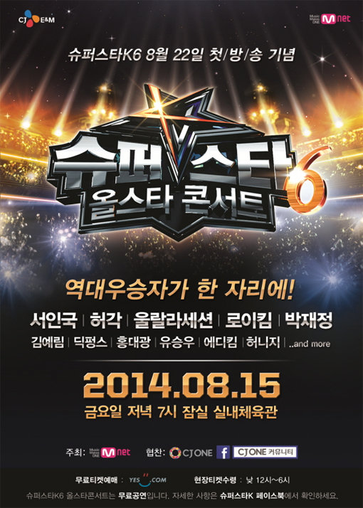 Mnet은 21일 “8월 15일 광복절 저녁 7시 잠실 실내체육관에서 개최되는 ‘슈퍼스타K6 올스타 콘서트’가 지난 18일 오후 티켓 오픈 단 7분 만에 무료 판매 좌석이 모두 매진되는 등 폭발적인 인기를 끌고 있다”고 밝혔다.