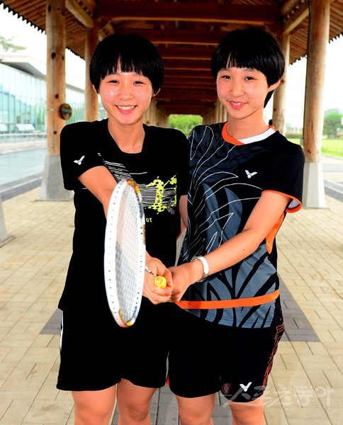24일 전남 화순 하니움문화스포츠센터에서 열린 이용대 올림픽 제패 기념 2013 화순-빅터 전국학교대항 배드민턴선수권대회에서 유봉중학교 쌍둥이 자매 성아영(왼쪽), 성나영이 포즈를 취하고 있다. 화순|박화용 기자 inphoto@donga.com 트위터 @seven7sola