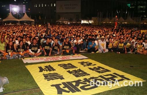 세월호 참사 100일째인 24일 서울광장에서 열린 세월호 참사 100일 추모 시낭송 그리고 음악회 '네 눈물을 기억하라'에서 참석자들이 세월호 특별법 제정을 촉구하며 구호를 외치고 있다.
