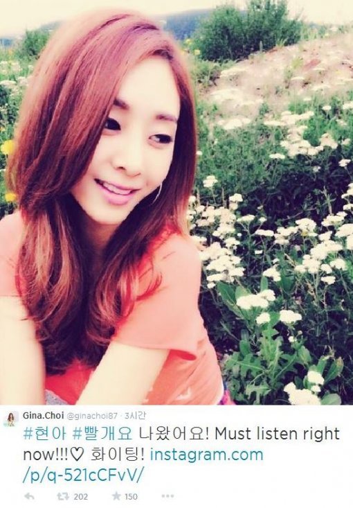 28일 오후 지나는 자신의 트위터를 통해 "현아 '빨개요' 나왔어요! Must listen right now!!! 화이팅"이라는 글을 게재했다.