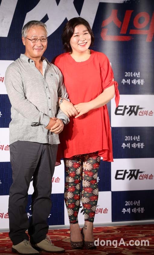 배우 이경영(왼쪽)과 고수희가 29일 오후 서울 광진구 롯데시네마 건대입구에서 열린 영화 타짜 신의 손(이하 타짜2) 제작보고회에 참석해 포토타임을 하고 있다.