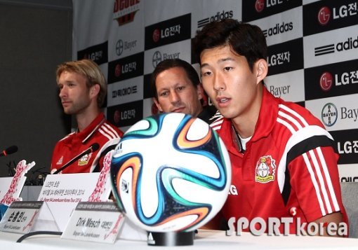 29일 오후 서울 상암동 월드컵경기장 기자회견장에서 열린 `LG전자 초청 바이엘 04 레버쿠젠 코리아투어 2014` 기자회견에 참석한 레버쿠젠 손흥민이 취재진의 질문에 답하고 있다.