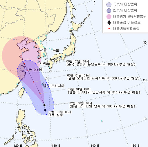 나크리는 31일 오전 9시 일본 오키나와 남남서쪽 약 310km 부근 해상까지, 내달 1일 오전 9시에는 일본 오키나와 서북서쪽 약 300km 부근 해상까지 올라올 것으로 예상된다.