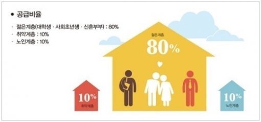 발표에 따르면, 대학생·사회초년생·신혼부부 등 젊은 계층에게 행복주택의 80%가 공급될 예정이다. 나머지 20%는 취약계층 및 노인계층에게 제공된다.