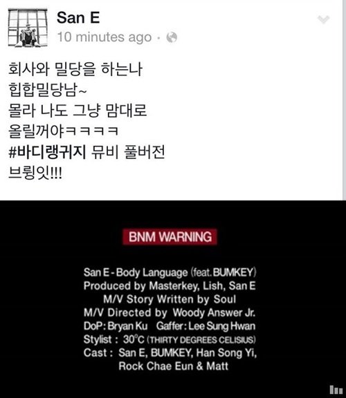 1일 산이는 자신의 SNS에 “회사와 밀당을 하는 나. 힙합밀당남. 몰라 나도 그냥 마음대로 올릴 거야. 바디랭귀지 뮤비 풀버전. 브륑잇”이란 글과 함께 ‘바디랭귀지(Body Language)’ 뮤직비디오를 공개했다.