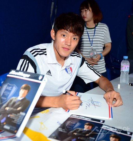 수원 홍철이 3일 수원월드컵경기장에서 열린 포항전에 앞서 팬 사인회에 참석했다. 경고누적으로 포항전에 출전하지 못한 홍철은 ‘1일 잡지판매원’으로 변신했다. 수원|김민성 기자 marineboy@donga.com 트위터 @bluemarine007