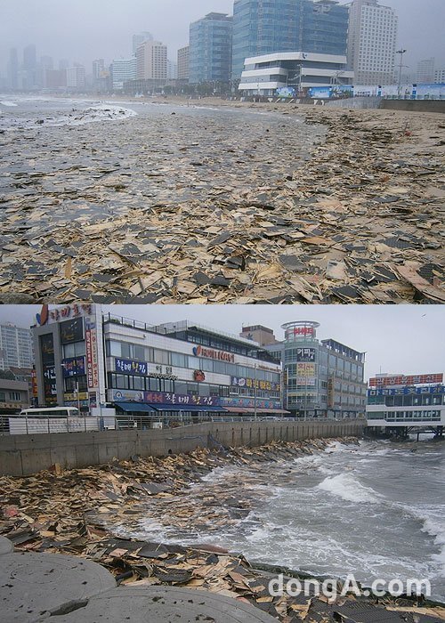 해운대 구청 관광시설관리사업소 관계자는 “태풍 나크리의 영향으로 폐목재들이 밤사이에 조류를 타고 해수욕장으로 밀려들었다”고 설명했다.