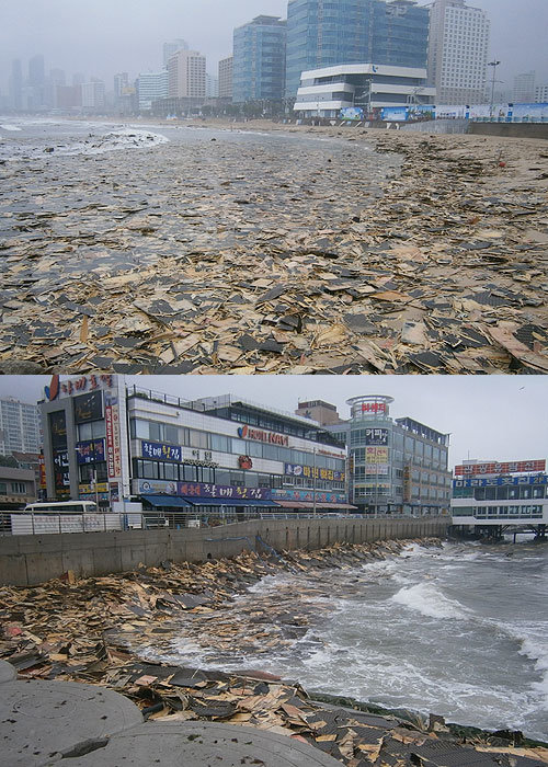 부산 해운대 해수욕장에 태풍 나크리에 이어 폐목재가 덮쳤다.