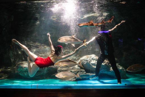 대형 수조에서 물고기들과 함께 국가대표 싱크로나이즈드 선수 출신 연기자가 펼치는 다양한 장르의 댄스가 매력적인 ‘수중댄싱 63’. 사진제공|한화리조트