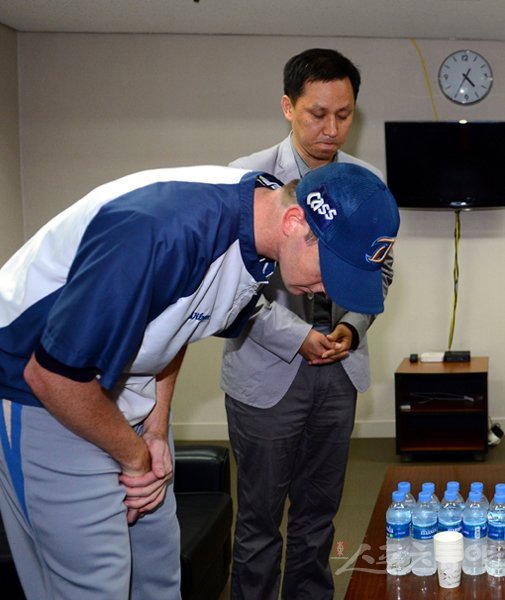 3일 문학 SK전에서 심판판정에 불만을 갖고 거친 욕설로 퇴장당한 NC의 외국인투수 찰리 쉬렉(왼쪽)이 다음날 문학구장을 찾아 팬들에게 고개를 숙이고 있다. 오른쪽은 NC 야구단 배석현 단장. 문학|김민성 기자 marineboy@donga.com 트위터 @bluemarine007