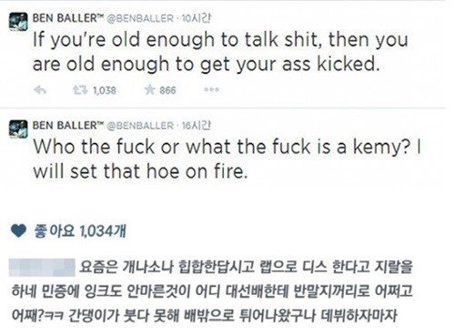 누리꾼들은 이날 벤볼러의 글에 "벤볼러, 이 사람은 또 뭐야" "벤볼러, 케미 디스곡에 열 받았네" "벤볼러, 말 막하는 것 같다" 등의 반응을 보였다.