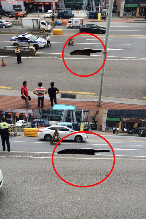공개된 사진에는 왕복 6차선 도로 한복판에 생긴 싱크홀의 모습이 담겨 있다. 특히 싱크홀 주변에는 경찰이 차량통제에 나선 모습과 이를 구경하기 위해 몰려진 사람들의 모습이 담겨 시선을 모은다.