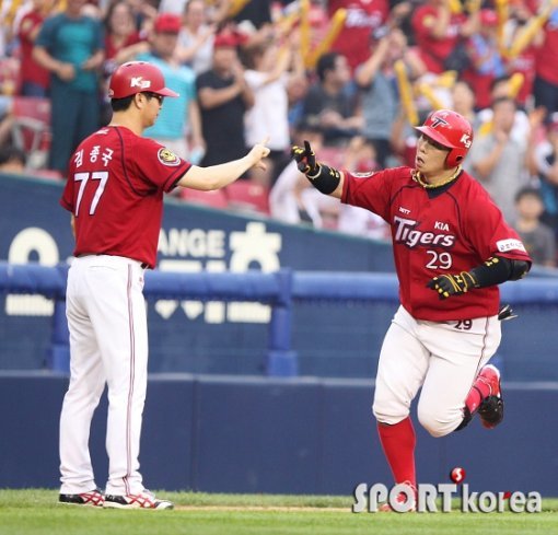 5일 오후 서울 잠실야구장에서 열린 ‘2014 프로야규’ 두산 베어스 대 KIA 타이거즈 경기 2회초 KIA 선두타자 나지완이 두산 선발 유희관을 상대로 선제 솔로홈런을 친 후 그라운드를 돌며 김종국 3루코치의 환영을 받고 있다.