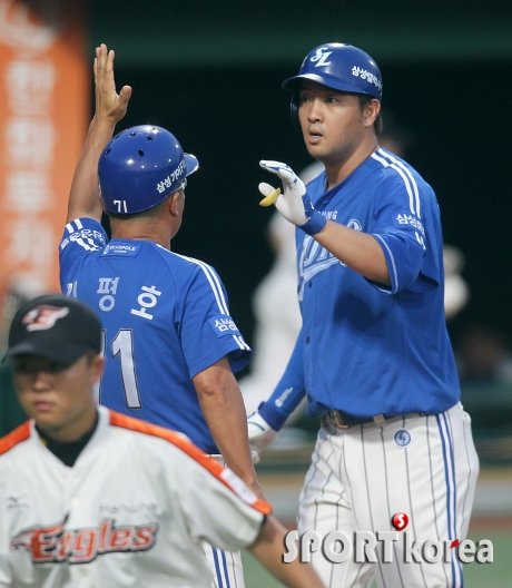 5일 청주구장에서 열린 ‘2014프로야구’ 한화 이글스와 삼성 라이온즈의 경기에서 삼성 채태인이 3회초 1사 2루 때 비거리110미터 우월 투런홈런을 치고 홈인하며 김평호코치의 환영을 받고 있다.