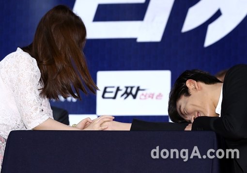 배우 최승현이 5일 오후 서울시 광진구 건국대학교 새천년홀에서 열린 영화 ‘타짜- 신의 손(타짜2)’ 쇼케이스에서 팬과 팔씨름을 하고 있다.