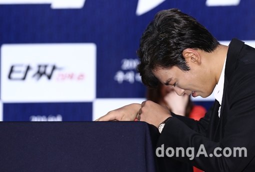 배우 최승현이 5일 오후 서울시 광진구 건국대학교 새천년홀에서 열린 영화 ‘타짜- 신의 손(타짜2)’ 쇼케이스에서 팬과 팔씨름을 하고 있다.