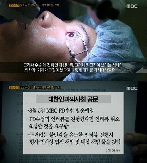지난 5일 방송된 MBC 'PD수첩'에서는 라식 혹은 라섹 수술 후 부작용을 겪은 사람들의 사연이 소개됐다.