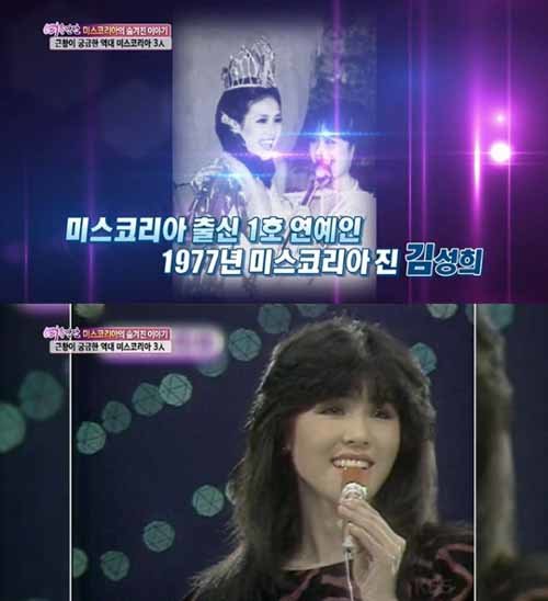 이날 방송에서 출연자들은 ‘근황이 궁금한 역대 미스코리아 3인’이라는 주제로 이야기를 나눴다. 이 3인에는 김성희 장윤정 궁선영이 꼽혔다.먼저 연기자 가수로 왕성하게 활동했던 김성희의 근황이 소개됐다