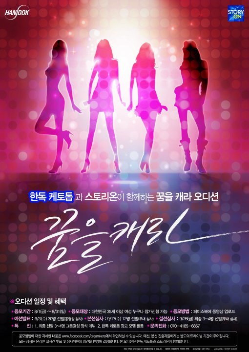 35세 이상 여성이 31일까지 ‘꿈을 캐라’의 페이스북(facebook.com/dreamkera)에 노래, 댄스 동영상을 올리면 신청 접수가 된다. 누리꾼들은 오디션 참가자들의 영상을 페이스북에서 실시간으로 확인할 수 있고, 마음에 드는 참가자에게 투표를 할 수 있다.