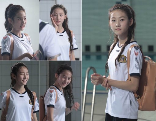 김새론은 이날 사진에서 천국고 체육복을 입고 수영장에서 한창 촬영을 진행 중이다. 장난기 어린 엉뚱한 표정을 짓고 있는가 하면 청초한 미소로 성숙미를 내뿜고 있기도 하다.