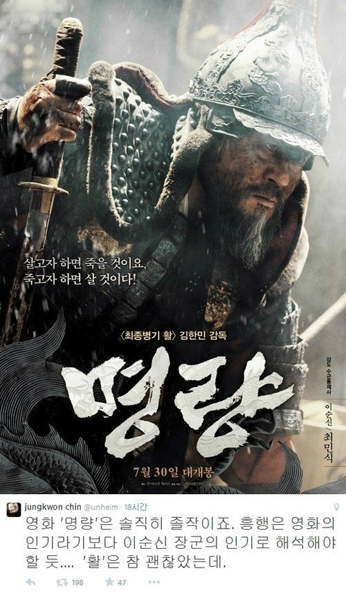 그러나 진중권은 ‘명량’을 두고 흥행과 별개로 ‘작품자체는 졸작’이라는 평가를 내려 누리꾼들 사이에서 설전이 오고가고 있다.