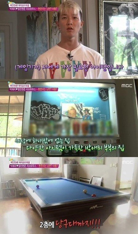 이날 방송에서 팝핀현준 박애리 부부는 집에 있는 각종 게임기와, 당구대에 이어 자판기를 선보였다. 보통의 집에서는 볼 수 없는 소품들.