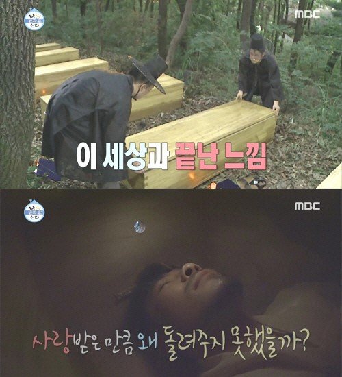 또한 노홍철은 수의로 갈아입은 뒤 유언장을 작성한 후 입관 체험을 했다. 이어 노홍철은 숲속으로 향해 손발을 묶고 관 안에 몸을 뉘이며 “관에 있을 때 고마운 분들에게 표현을 못한 게 가장 아쉬웠다”는 소감을 전했다.