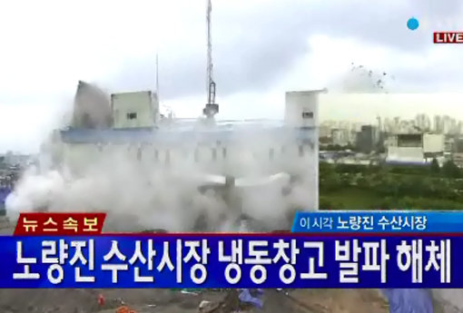 노량진 수산시장 내 3천여 평 규모의 낡은 냉동창고가 발파 해체됐다.
