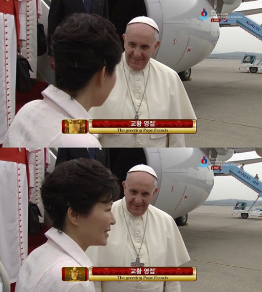 이날 교황의 방한에 직접 영접에 나선 박근혜 대통령은 "이번 교황의 방문을 통해 한반도에 평화와 화해의 새시대가 열리길 기대한다"며 "짧은 일정이지만 평안한 방한이 되길 바란다"고 말했다. 이에 교황은 "그동안 많은 신경을 써줘서 고맙다"며 "가슴깊이 슬픔을 간직하고 있다"고 전했다.