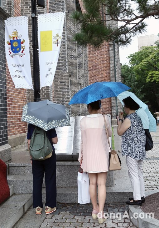 서울시 중구 명동성당에 14일 오후 프란치스코 교황의 방한 환영하는 사람들이 모여있다.