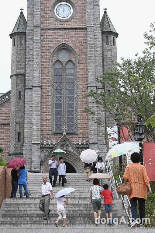 서울시 중구 명동성당에 14일 오후 프란치스코 교황의 방한을 환영하는 사람들이 성당으로 들어가고 있다.