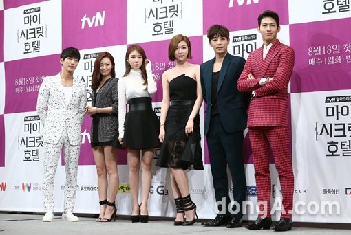 배우 남궁민(왼쪽부터), 이영은, 유인나, 하연주, 진이한, 최정원이 14일 오후 서울시 강남구 임피리얼팰리스호텔에서 열린 tvN 월화드라마 ‘마이 시크릿 호텔’(이하 마시크) 제작발표회에서 포토타임을 하고 있다.
