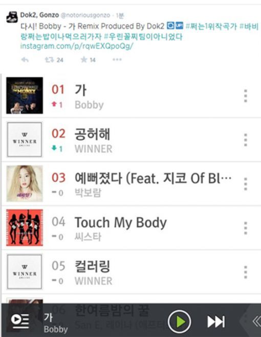 14일 오후 도끼는 자신의 인스타그램에 "1위 작곡가. 바비랑 밥이나 먹으러 가자. 우린 꼴찌 팀이 아니었다"라는 메시지와 함께 음원사이트 순위를 캡처해 게재했다.