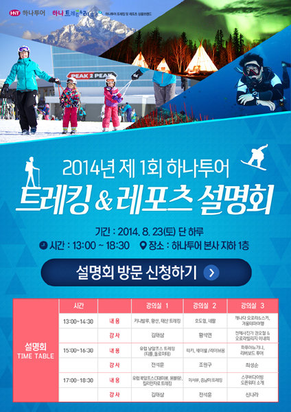 이번 설명회에는 천체사진가 권오철 작가와 오로라빌리지 이내희 대표가 소개하는 ‘캐나다 오로라&스키, 겨울테마여행’을 비롯해 ‘알프스 트레킹’, ‘중남미 트레킹’, ‘파푸아뉴기니 스쿠버다이빙’ 등 총 9개의 테마를 소개한다. 테마별로 각 지역과 레포츠 전문가들이 생생한 정보를 전달한다. 설명회 강의 중 3개를 들으면 추첨을 통해 2014∼2015 스키장 시즌권 및 트레킹·스쿠버다이빙 용품 등을 경품으로 증정한다. 또한 현장 예약자에게는 하나투어 마일리지를 추가 지급한다. 신청은 하나투어닷컴 기획전 페이지에서 확인 가능하며, 신청자 중 선착순 200명에게 영화관람권 및 음료 쿠폰을 제공한다.