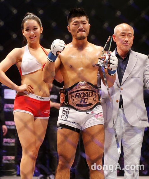 이종격투기 선수 권아솔이 17일 오후 서울 송파구 방이동 올림픽공원 올림픽홀에서 열린 '로드FC 017' 경기에서 일본 쿠메 다카스케를 상대로 챔피언이 된 후 포즈를 취하고 있다.