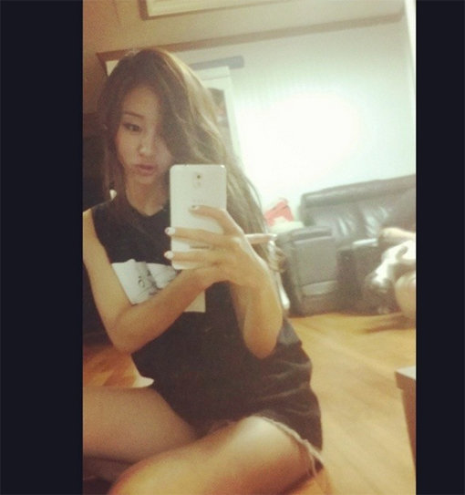 사진에는 지나가 거실에서 거울을 이용해 사진을 찍는 모습이 담겨 있다. 지나는 손으로 어딘가를 가리키며 입술을 내민 채 깜찍한 애교를 부리고 있다. 이 가운데 내추럴한 하의실종 패션에 드러난 꿀벅지가 시선을 사로잡는다.