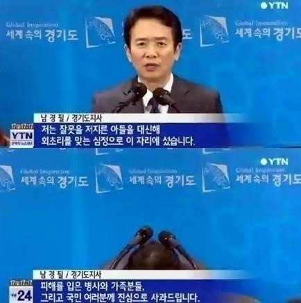 남경필 지사는 지난 17일 기자회견을 열고 “잘못을 저지른 아들을 대신해 회초리를 맞는 심정으로 이 자리에 섰다”면서 “피해를 본 병사와 가족 분들, 국민 여러분께 진심으로 사과드린다”고 밝혔다.