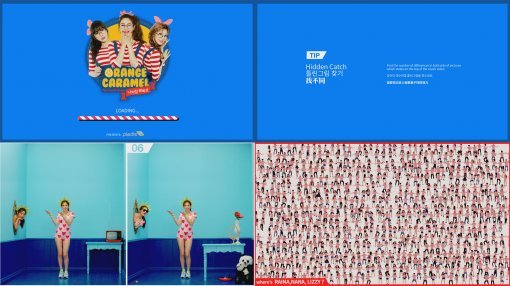 특히 ‘오캬를 찾아라’의 연장선에서 ‘숨은 오캬 찾기’와 ‘틀린 그림 찾기’를 난이도에 맞춰 구성하고 ‘월리를 찾아라’의 오캬 버전에서는 춤을 추고 있는 오렌지캬라멜의 멤버들을 찾게 하는 고난이도의 문제까지 실제 게임 같은 형식으로 뮤직비디오에 담아 보고 즐기는 뮤직비디오가 아니라 보는 이들로 하여금 직접 참여 하게하는 신개념 뮤직비디오를 완성했다.