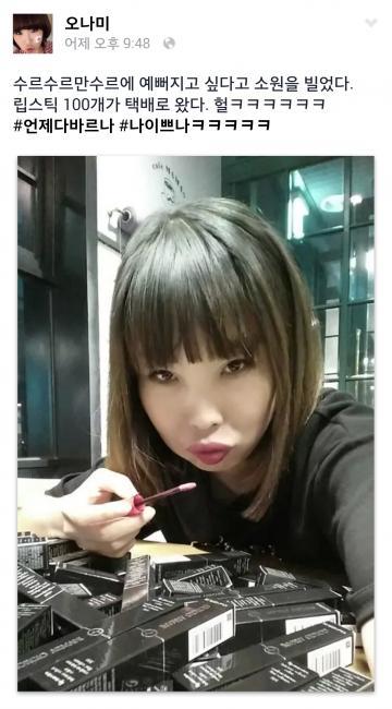 오나미는 17일 자신의 페이스북을 통해 `수르수르만수르에 예뻐지고 싶다고 소원을 빌었다. 립스틱 100개가 택배로 왔다. 언제 다 바르지? 나 이쁘나`라는 글과 함께 인증 사진을 공개했다.