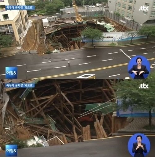 18일 부산 지역에 물폭탄이 쏟아진 가운데 해운대 오피스텔 신축 공사장이 붕괴되는 사고가 일어났다.