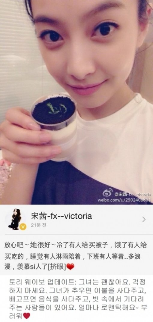 19일 빅토리아는 중국 SNS 웨이보를 통해 "그녀는 괜찮아요. 걱정하지 마세요. 그녀가 추우면 이불을 사다주고, 배고프면 음식을 사다주고, 빗 속에서 기다려주는 사람이 있어요. 얼마나 로맨틱해요~ 부러워"라는 글을 남겼다.