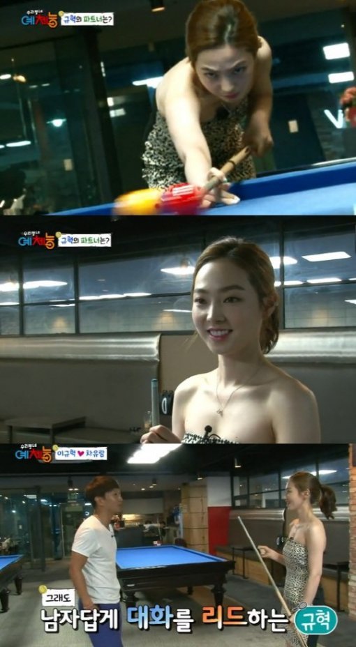 차유람은 당구 시범을 보이며 가슴골이 살짝 드러난 모습으로 글래머러스한 매력을 뽐냈다.